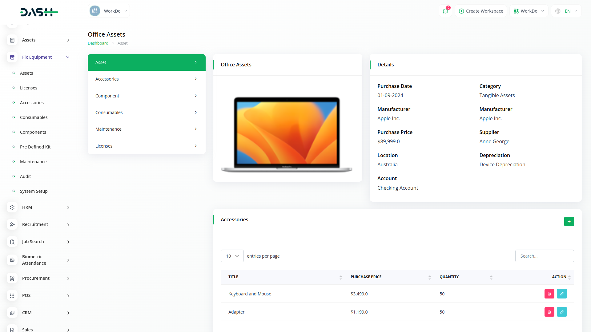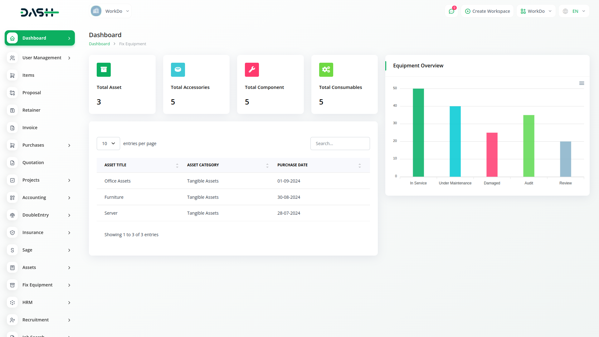 Establish module for managing equipment, facilities, vehicles and other assets based on industry standards. Keep track of individual assets and schedule, assign and record maintenance work.