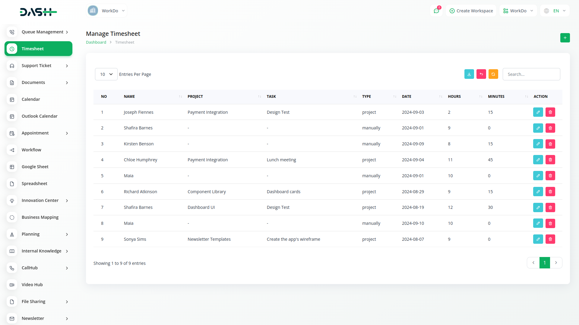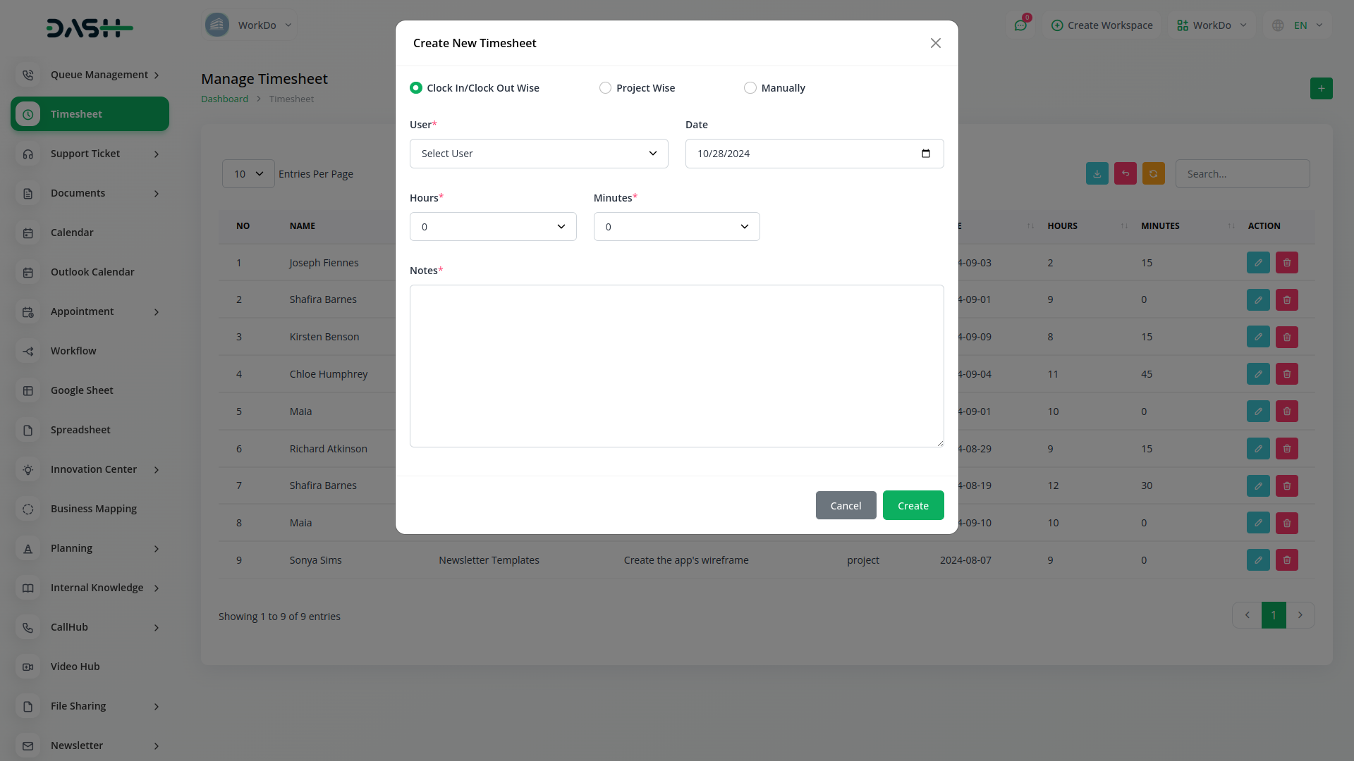 Create a timesheet by assigning Projects, Tasks, and Users. Assign a starting and ending date as well as a time. This allows you to manage your project most efficiently.